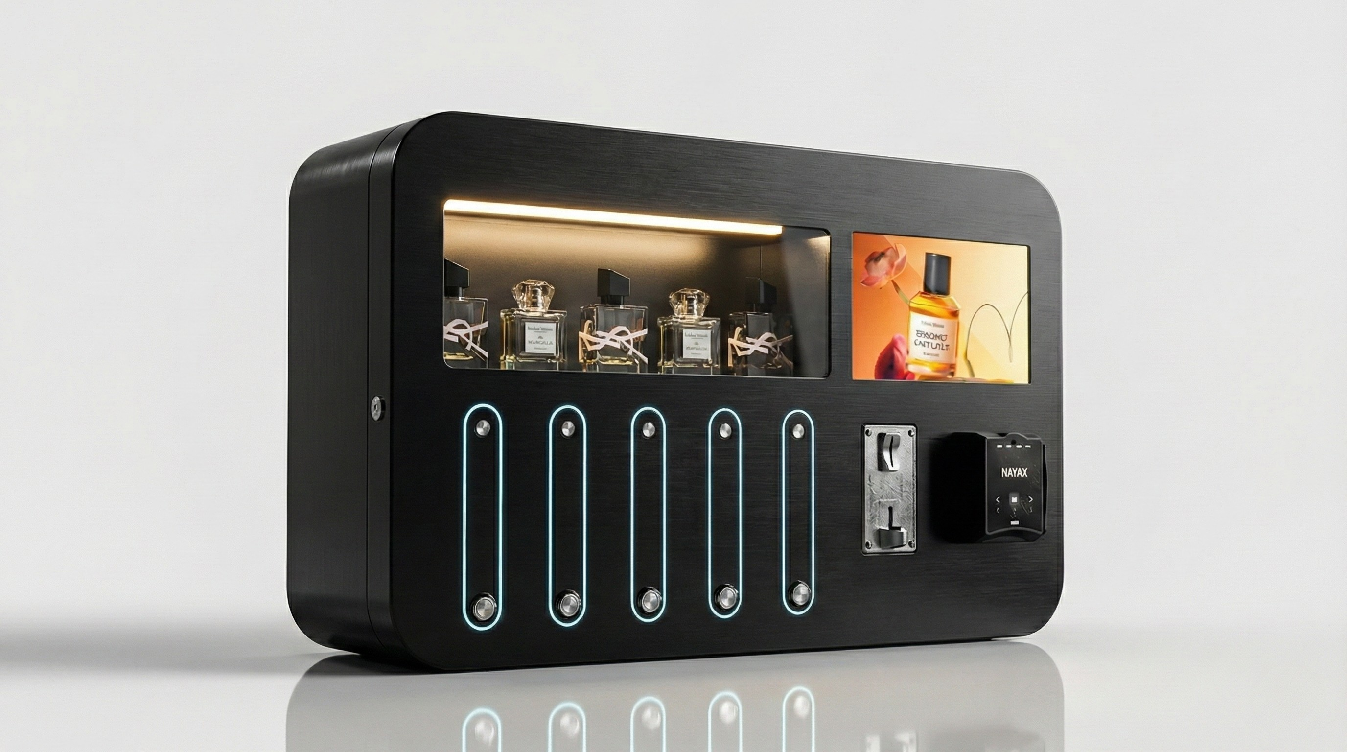 Système d'éclairage premium pour mettre en valeur les 5 flacons.